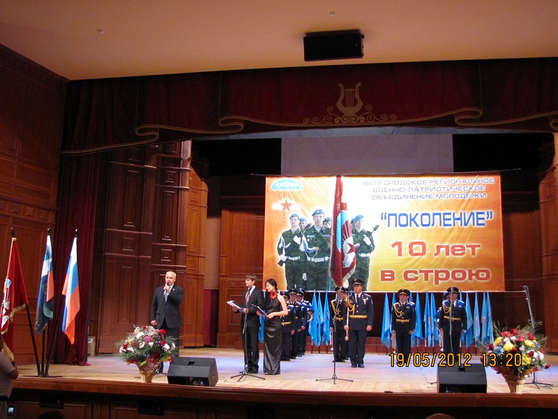 Торжественное собрание, посвящённое 10-й годовщине Белгородского регионального военно-патриотического объединения молодёжи «Поколение», состоялось в городской государственной филармонии. Депутат Государственной Думы, председатель Совета военно-патриотического объединения «Поколение» О. В. Лебедев, руководители города и области поздравили организацию с первым юбилеем. С Божьим словом выступил протоиерей Петр Иванов, настоятель Храма Святых Апостолов Петра и Павла. Активисты организации были награждены медалями, грамотами, ценными подарками и денежным поощрением. Хочется отметить, что в повседневной жизни и работе молодёжного объединения «Поколение» видна поддержка со стороны государства, заинтересованность и участие руководства города и области. А одним из главных итогов работы можно считать тот факт, что воспитанники клубов попадают служить в элитные подразделения российской армии, войска ВДВ, морскую пехоту и спецназ. Многие ребята прошли различные горячие точки и вернулись домой.
