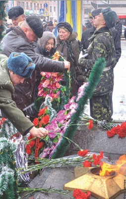 — Нам, бердичівцям, є ким і чим пишатися, — сказав біля Вічного вогню міський голова Бердичева Василь Мазур. — Навіть люті січневі морози 69 років тому не змогли встояти перед теплом людських сердець і гарячими обіймами, котрими городяни зустрічали своїх визволителів. У Велику Вітчизняну Бердичів увійшов з кількістю населення у 75 тисяч. Гітлерівці забрали життя майже в половини. Визволяли місто кілька стрілецьких дивізій за підтримки танкових з'єднань. Сьогодні у Бердичеві живуть лише двоє визволителів — Микола Калинський та Веніамін Коваленко. Низький їм уклін від усіх нас!..