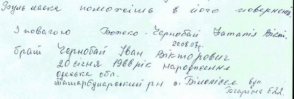 Сестра Наталья всегда верила, что брат жив, хотя в доме хранится «похоронка» - погиб 9 сентября 1984 года, на ней подписи командиров воинской части 86997 – Чикал, Кархин. Сегодня Наталья Божко-Чернобай обращается ко всем людям, кто как-то может принять участие в этом деле:
